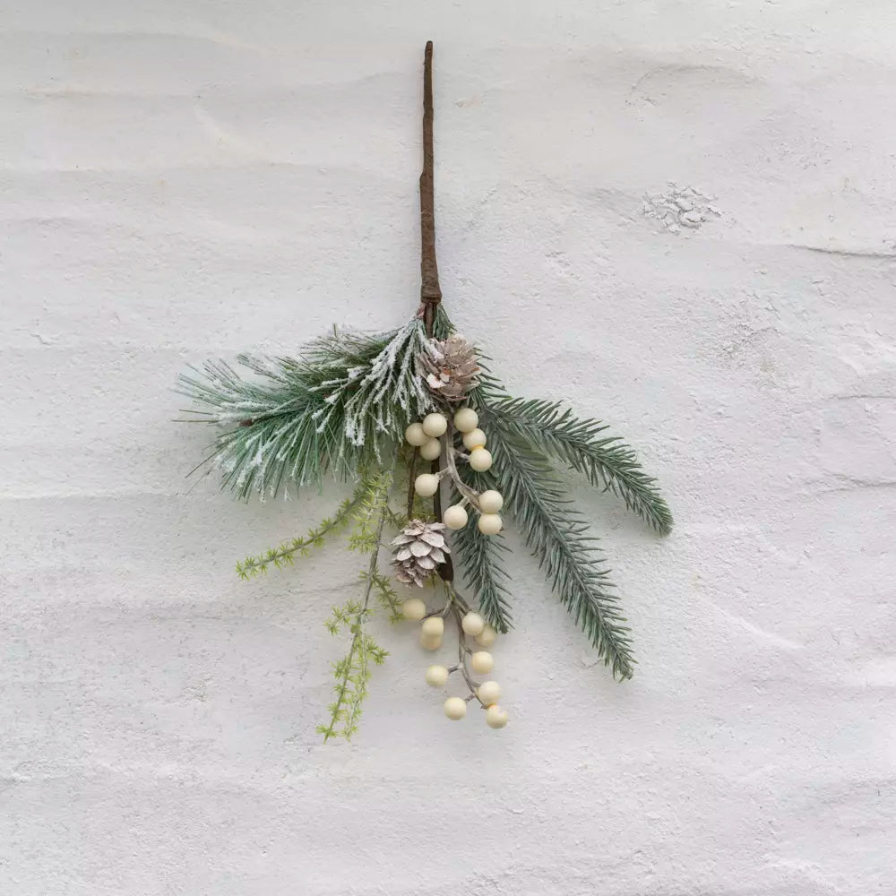 Enhance your festive décor with our 30cm white berry faux flower sprig. Beautifully adorned with fern cones, fir tree foliage and sprinkled with an ice effect for an authentic winter touch. Ideal for those who enjoy stylish and effortless Christmas charm.